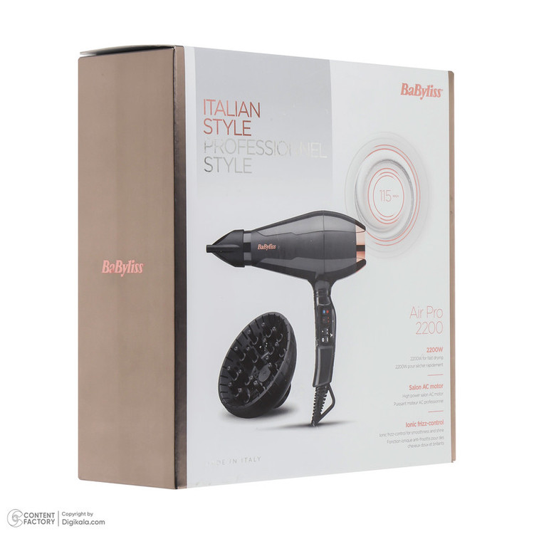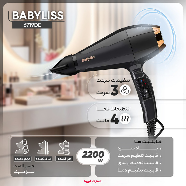 سشوار حرفه‌ای بابیلیس مدل 6719DE، موتور AC با توان مصرفی 2200 وات، دارای قابلیت تعویض سری و باد سرد، دارای حلقه آویختن، با حالت صاف‌کننده، حجم‌دهنده و فرکننده، وزن 990 گرم، تنظیم حرارت 4 حالته و کنترل سرعت 3 حالته، به همراه 2 سری متمرکزکننده