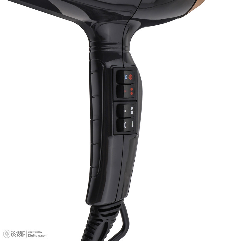 سشوار حرفه‌ای بابیلیس مدل 6719DE، موتور AC با توان مصرفی 2200 وات، دارای قابلیت تعویض سری و باد سرد، دارای حلقه آویختن، با حالت صاف‌کننده، حجم‌دهنده و فرکننده، وزن 990 گرم، تنظیم حرارت 4 حالته و کنترل سرعت 3 حالته، به همراه 2 سری متمرکزکننده